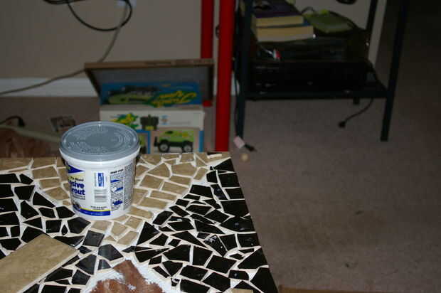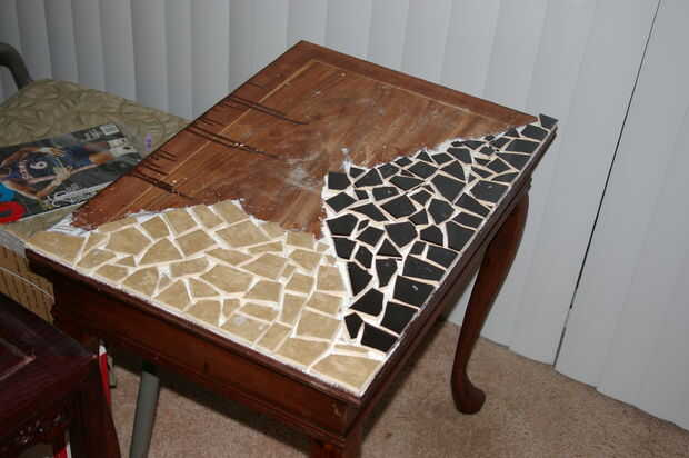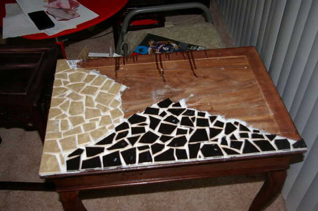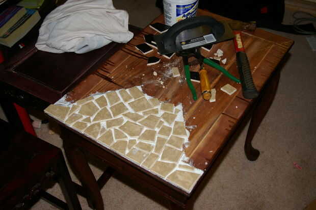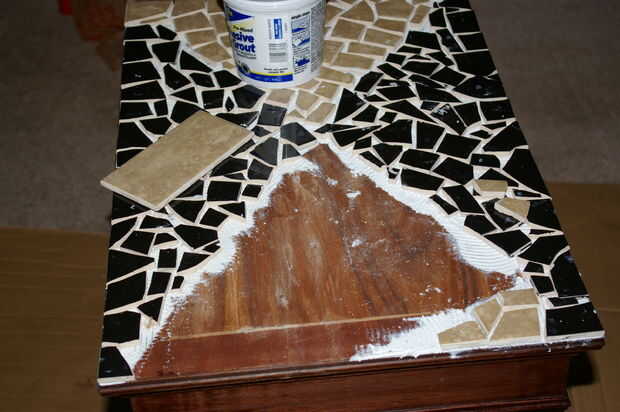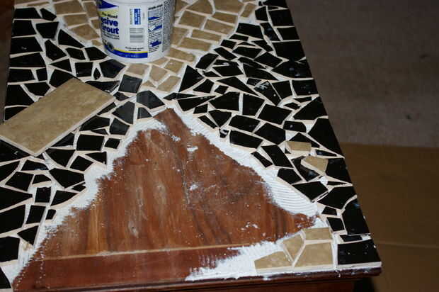 Tomé dos fichas de diferente color, rompió para arriba y crea el patrón en forma de triángulo. No quiero bordes filosos por lo que trabajé desde el exterior, con los bordes más suaves en el exterior de la tabla. Tienes que pensar en esto como rompecabezas y Pon trozos de azulejo donde mejor encajan. También puede venir para arriba con su propio patrón. Extienda el adhesivo en una capa delgada utilizando la muesca de la herramienta. Presione las piezas rotas para se peguen. Hice una pequeña sección en un momento, esperando que se seque y luego continuó. Una vez completo con toda la tabla, aplique el adhesivo como una planta, amplia el exceso y limpiar cualquier residuo. Una vez seco el adhesivo, se puede aplicar un sellador de lechada para proteger la superficie. Tenga en cuenta que la tabla va a ser un poco más pesada una vez que todo esto se completa.