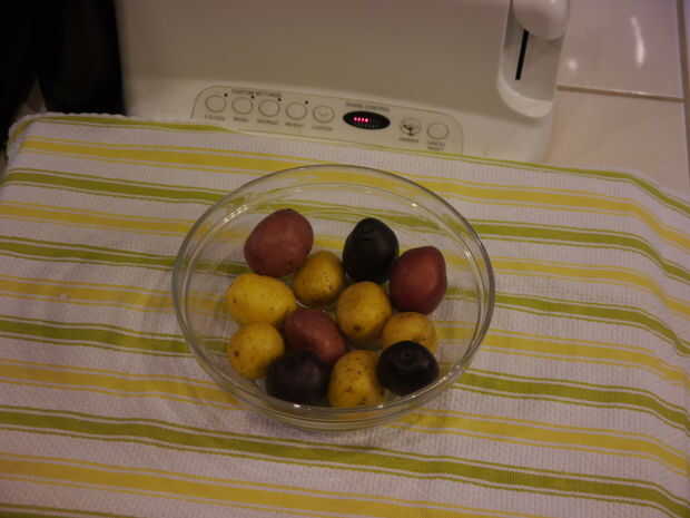 Empezar con aproximadamente 1/2 libra por persona de mini patatas. Me gusta usar una mezcla de morado, rojo y oro. Colocar en un intestino seguro de microondas añadir un poco de agua y tapa. Microondas en alto por 5 minutos o hasta que estén blandos lo suficiente como para romper