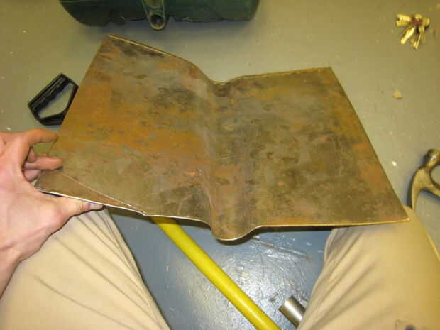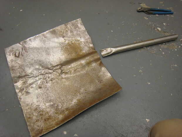 Para dar la forma de cuchara, dobla el metal alrededor de la manija, luego martilló el tramo inferior para dejar una hoja plana.