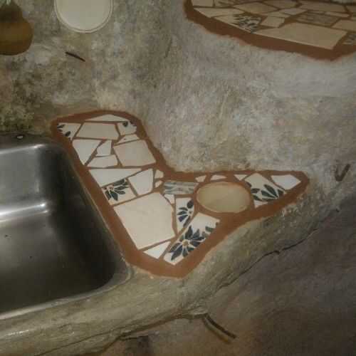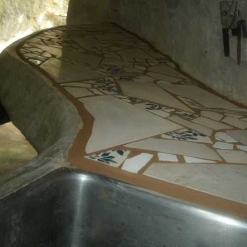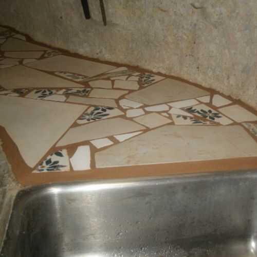 este proyecto, mi primer intento en un mosaico de azulejos y una forma de utilizar algunos azulejos sobrantes a la izquierda después de labrar el suelo del sótano. El mosaico se ve complicado, pero no es. He instalado en el vestíbulo de nuestro bunga