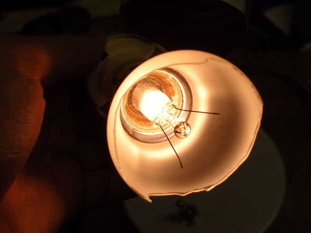 Conectar la lámpara a la luminaria y el poder en y he aquí la luz de una bombilla rota. Y vuelva a colocar la luminaria a la caja (encontrar quitando la luminaria de la vivienda hace conectar la bombilla que mucho más fácil)