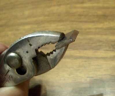 Corte un trozo de hierro de 1/2 pulgada correa por lo que es, siempre y cuando la correa es ancha. Moler un borde largo a 45 grados.