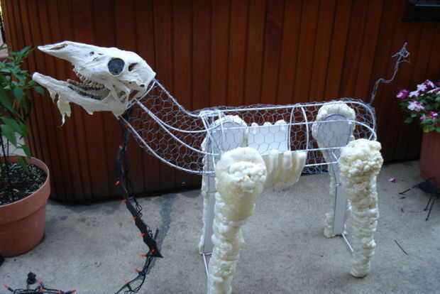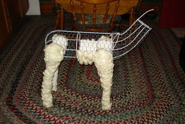 Tiempo de preparación del marco. Primero retire el mecanismo del motor si es un ciervo animado. La cabeza será demasiado pesada para este motor así quitarlo por lo que puede utilizar para otra cosa. A continuación cortar la cabeza de los ciervos con una sierra de mano o la herramienta de elección, pero dejar la pieza superior de alambre se deslice el cabezal sobre. Si es un ciervo animado, también deberás fijar el cuello en el cuerpo de los ciervos en cualquier posición que desee. He utilizado zip lazos. Luego cubrir el cuerpo con el alambre de pollo para que cuando vayas a cadáver del cuerpo no sag entre las secciones de cable. Puede usar alambre de pollo en las piernas o ir con la espuma en aerosol para darle más dimensión. Tomar la cartulina de espuma de poliestireno y cortar para que quepa dentro de las áreas de la pierna. Ahora rociar la espuma para darle musculatura. Tome otro trozo de cartulina de espuma de poliestireno y rap en la parte inferior de la cintura y uso la espuma de aerosol para crear unas costillas. Diseñar algo para una cola. Utilicé un trozo de alambre de pollo y había atado al extremo posterior.