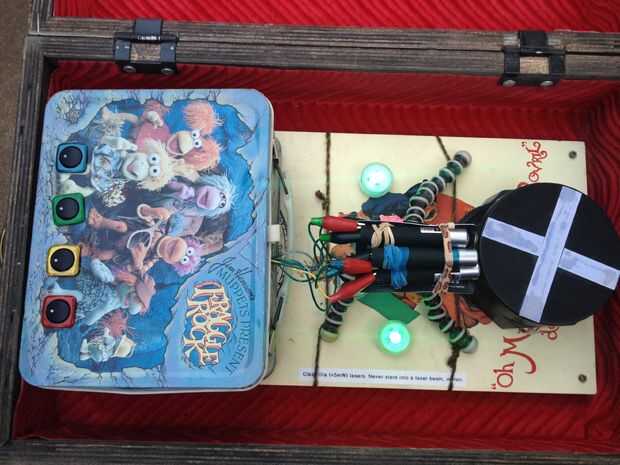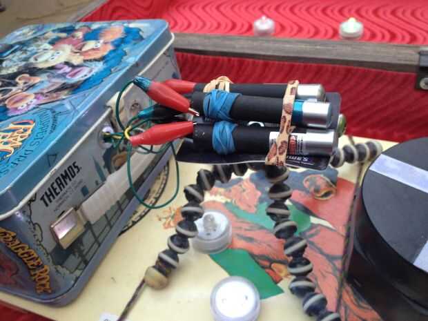 Poner bandas de goma alrededor de los punteros láser para mantener sus botones empujado hacia adentro. Goma el lío todo junto en un Mini trípode (estoy usando un Joby Gorillapod).