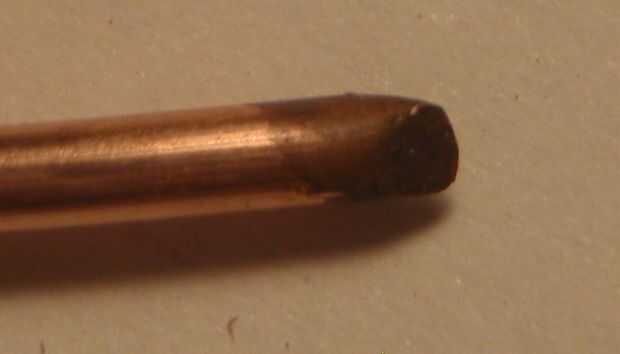 Corte el extremo puntiagudo y oxidado con unos alicates de corte recto (también usar un disco de corte de dremel para obtener rectas) a dejar un extremo recto que deja sólo una pequeña soldadura spot.