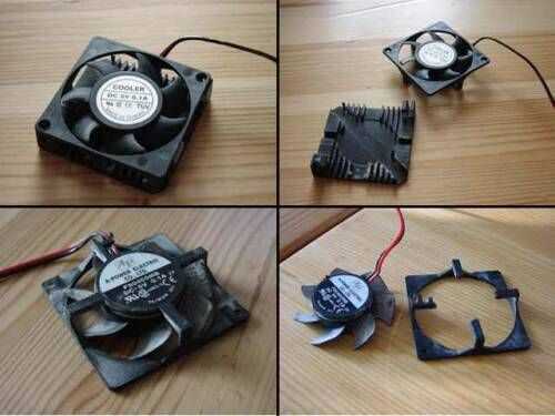 Sacar los dos tornillos pequeños que están sujetando el disipador y el ventilador juntos. Luego tomar el alicate y cortar el ventilador fuera de su marco.