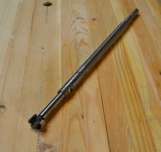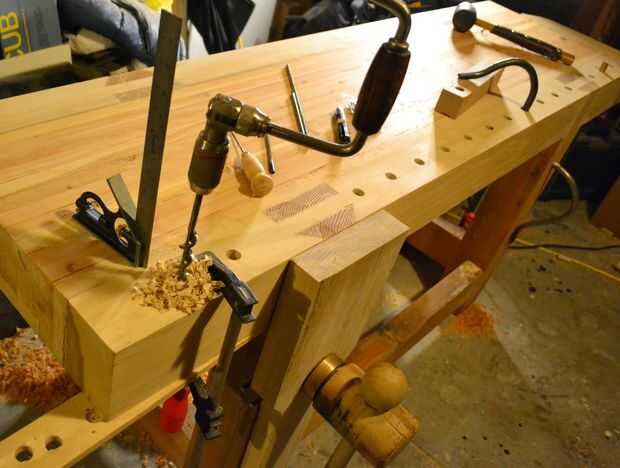 Cuando murió la batería me cambié a mi taladro que probablemente debería haber usado desde el principio. Una vez dentro de la madera, las flautas guían la punta hacia abajo. Que había preferido utilizar una pieza Forstner ya que hace los agujeros un poco más limpio, pero tenía que cada agujero limpio para obtener un ajuste perfecto para los perros de banco por lo que la llave era tan bueno una opción de la arena. Además, la broca de barrena evacuados los residuos mejor y no llegar tan caliente.