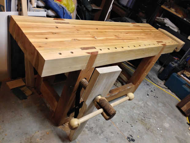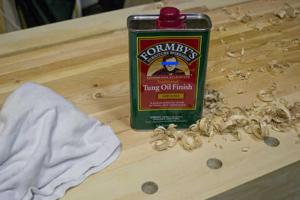 Después de un lijado ligero y trapo húmedo para desempolvar, se puede aplicar la primera capa de aceite.  Un banco de trabajo llevará un lote de rasguños y rayones profundos y un barniz filmógeno no se bien a esto.  Pero el aceite será el tiempo en agua, el vino y la tinta para madera.