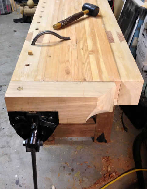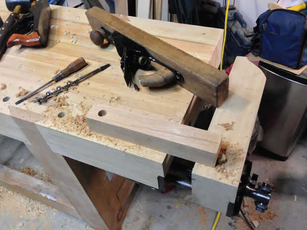 Un banco de trabajo debe ser capaz de sostener piezas de trabajo, de lo contrario es sólo una mesa muy pesada. En el lado izquierdo he instalado una prensa de pierna, detallado aquí. A la derecha he instalado una prensa de tornillo de liberación rápida cola y había equipado con una chuleta de madera grasa. Esto proporciona una mayor superficie de sujeción y tiene capacidad para un perro de banco. Para evitar que se oxiden I desmontar la mordaza, despojado de la pintura, luego pulido y recubrimiento claro de las piezas de metal desnudas. Para las piezas de cuerpo de hierro fundido apliqué una pátina de óxido negro y luego una capa transparente.