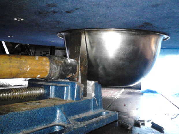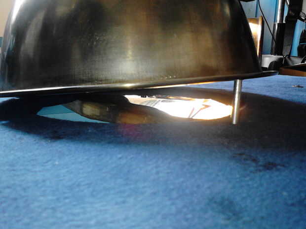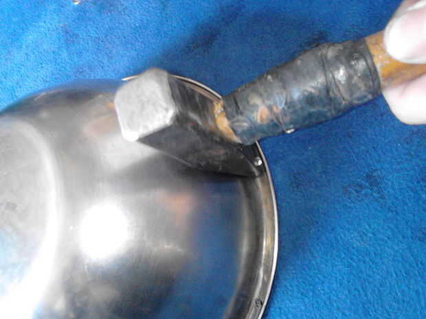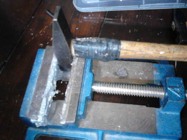 Ahora para el paso final! Toma un martillo viejo fijarlo en un benchvice (salvo que tenga una participación de metales) (cuadro 14). Poner uno de los remaches a través de la shieldboss y el escudo (foto 15), dale la vuelta y colocar en el "juego" para que el remache se basa en la participación (cuadro 16). Coloque una arandela sobre el remache y martillo abajo (cuadro 17), hacer esto para todos los remaches. Voltee todo el asunto y colocarlo en tu yunque, usar el martillo viejo junto a otra para cualquier marcas dejadas por el paso anterior (Figura 18).