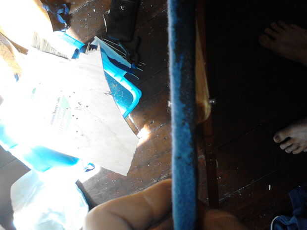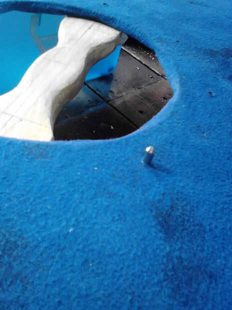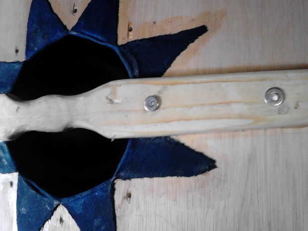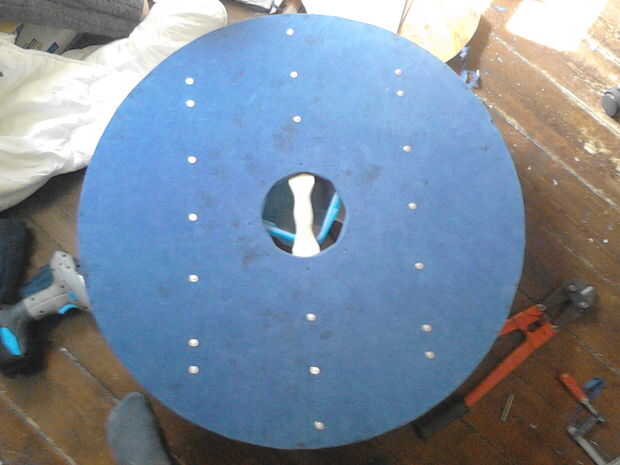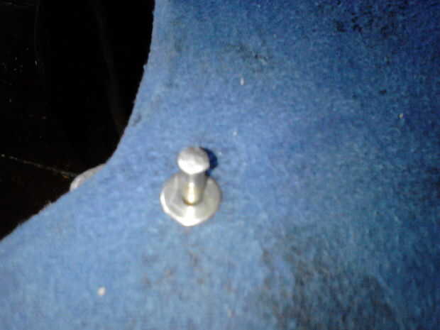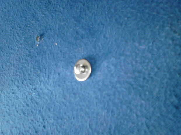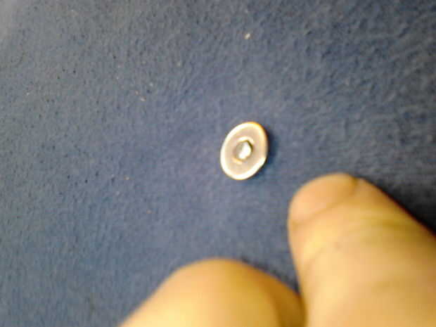 Tener una lavadora y añadir a la uña en la parte delantera de su escudo (el lado con la tela). Poner todo en su yunque (ish objeto) y remache de clavo (cuadros 4, 5 y 6). Dale la vuelta, añadir otra arandela y remache del otro lado (cuadros 7 y 8). Repita este proceso para todos pero el centro que se fije el shieldboss(picture 9).
