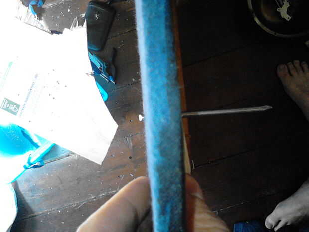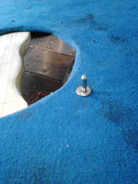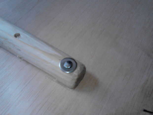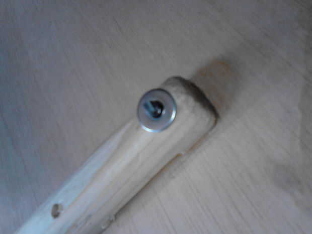 Tome un pedazo de clavo lo empuje a través de uno de los agujeros para las shieldboss, añada una arandela y remache en la parte superior (cuadros 10, 11, 12 y 13). Marque la altura a 1,5-2mm en el otro lado y retire el clavo y arandela. Corte la uña y repita este proceso para todos los agujeros de shieldboss (cuadro 13). Los que pasan por el mango son un poco más por supuesto.