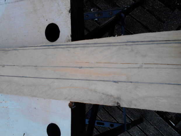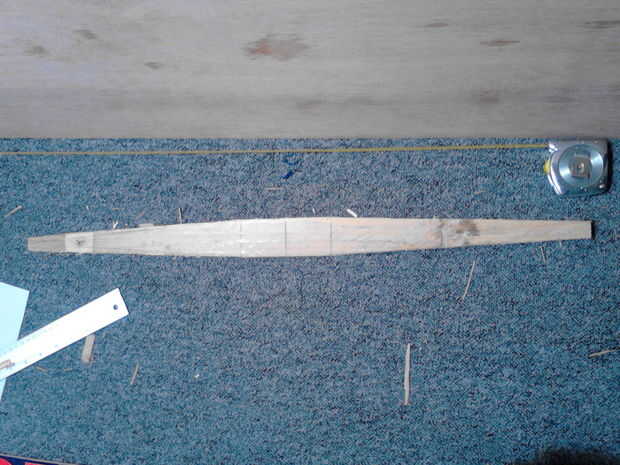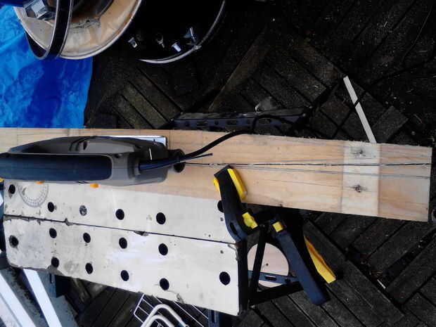 Cortar el mango con su rompecabezas y limpiar los bordes. El resto de la tabla se puede utilizar ahora para crear unas barras de refuerzo. Sacar 2 barras en el sobre 2 cm de ancho y 55cm de longitud y cortar estos.