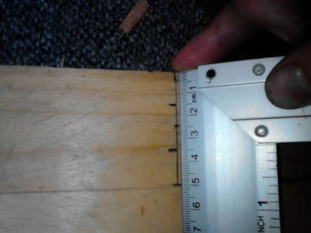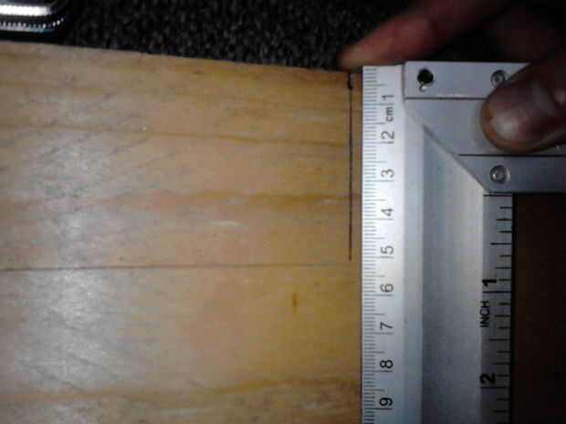 A continuación coloque algunas marcas de 1,5 cm de ambos bordes (cuadro 6), esto será el ancho de la manija / barras de refuerzo en las puntas. Tome una regla y trazar una línea desde las esquinas de los extremos para la marca mango.