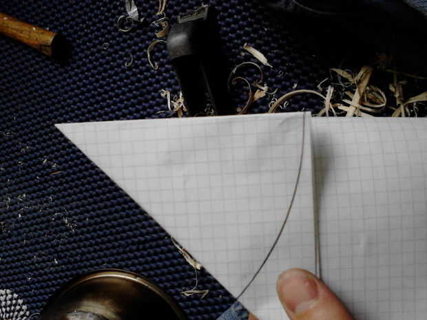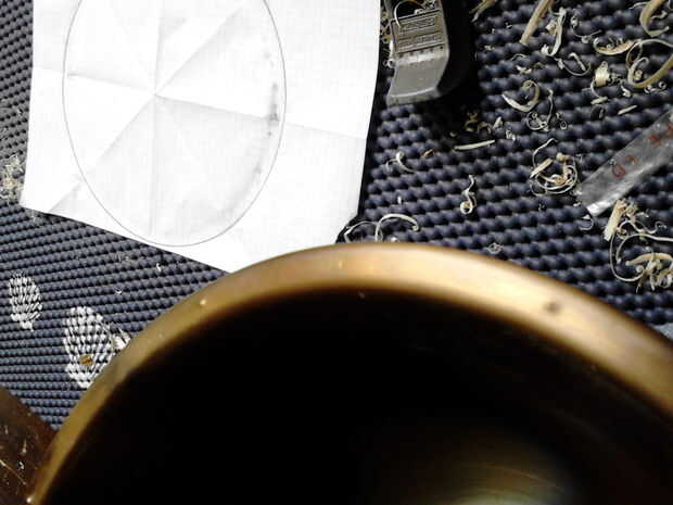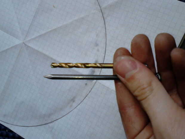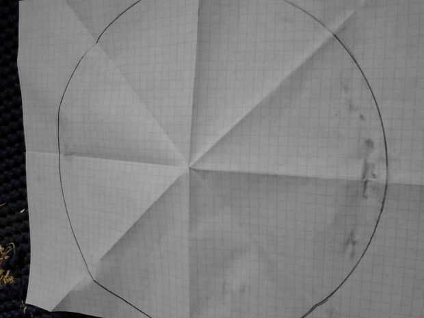 OK toma el pedazo de papel con el trazo y dóblalo tres veces para obtener ocho segmentos. Coloque el recipiente en la parte superior y punzón en cada doblez de papel (fotos 4 y 5).