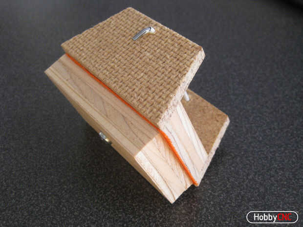 La pieza inferior es cuidadosamente alineada y sujeta con un tornillo para madera #6 x 3/4 (no cemento de contacto). Un poco pequeño de percha doblada completa el conjunto.