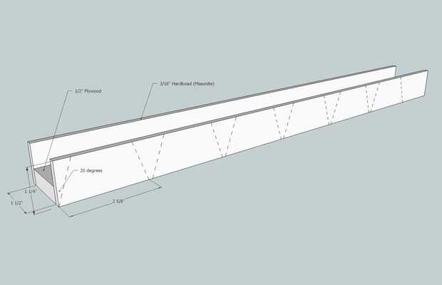 Usted puede 'futz' con estas dimensiones. Hacer el ángulo más agudo para una vuelta más apretada, hacer la bandeja más ancha o más estrecha, trajes de cualquiera que sea su diseño. Comencé cortando al hilo dos longitudes de la ½" madera contrachapada en un ancho de 1 1/2 pulgadas. Arrancaron dos tiras de igual longitud de madera prensada de 3/16 (¼" trabajo bien también) a un ancho de 1 1/4 pulgadas. Me pega y sujeta que tiras de la madera en la madera contrachapada de 1/2, formando una 'vaguada' en forma de U. En el dibujo se puede ver ya cómo se pliega la bandeja.