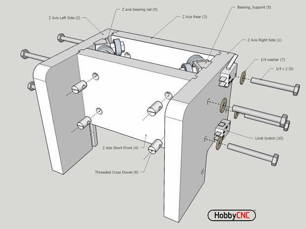 El eje de z proporciona el componente hacia arriba y abajo del movimiento. Como con todas las piezas, cuidado en el corte y el diseño son importantes para asegurar una calidad de salida de tu router. Es montado y se desliza sobre el eje y. El eje z se mantenga tu fresadora o Dremel o pluma o lo que sea que desea mover.