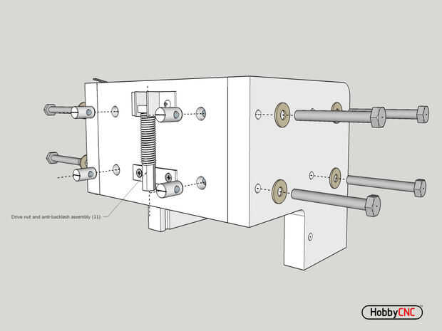 El tornillo de accionamiento de eje (no mostrado) a través de la parte superior del eje del hilo de rosca, añadir la tuerca cuadrada pequeña (parte de la contra reacción Asamblea), luego la primavera, luego hilo de rosca en la tuerca del cojinete lineal, asegurándose de que el resorte se comprime bien. Un taladro eléctrico con cuidado con abrazadera en un extremo de la varilla roscada acelerará este proceso.
