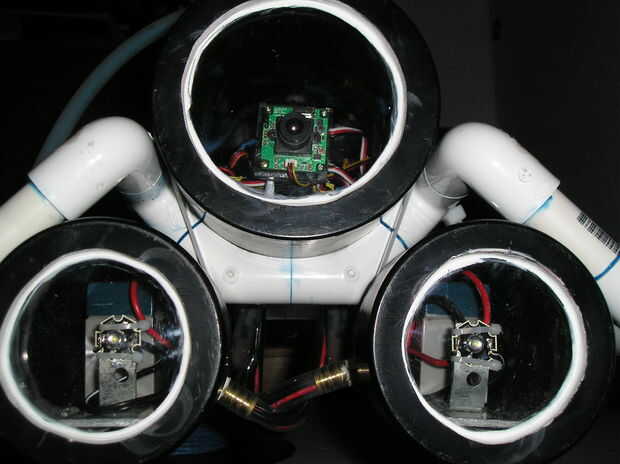 se trata de un ROV (vehículo operado remotamente) que hice que ofrece una cámara de video a bordo que envía detrás video directo a la laptop conectada al final de la soga. El robot también está conectado a un mando a distancia que permite maniobrar c