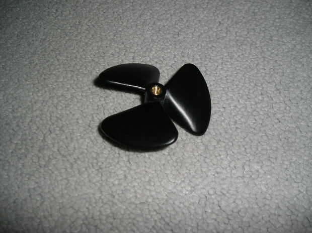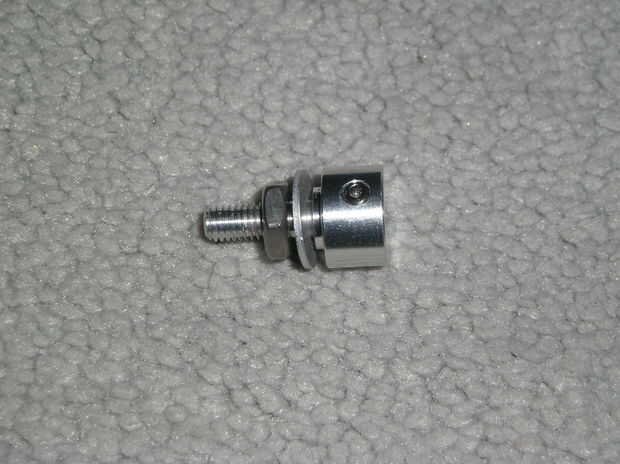 Paso 3: usar un adaptador de hélice para un avión para unir la hélice al eje. Tiene un tornillo de ajuste, y solo apretó la tuerca contra la rosca en el apoyo para que encaje en posición. Tuve que volver a pasar el adaptador de apoyo porque era un poco demasiado grande. Como una precaución extra, solía armario hilo para sellar el conjunto juntos.