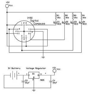 En la foto, los cuatro cables en la carcasa plata irá a la superficie y la interfaz con la computadora para mostrar la dirección que estoy enfrentando. Estoy escribiendo un programa que girará una imagen del robot para mostrar la dirección. Sin embargo, esto podría tomar un tiempo así que por ahora sólo puedo usar los LEDs