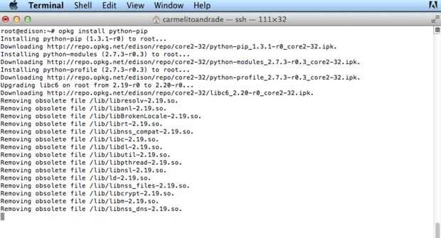 Para instalar el matraz de la aplicación web vamos a utilizar pip para instalarlo, que significa que tenemos que instalar el python paquete de pip en primer lugar, utilice el siguiente comando una vez que tengas así en el edison.