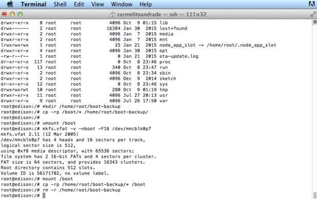 Utilice el siguiente comando para espalda-aumentar y restaurar la partición de arranque, como se muestra en la segunda pantalla