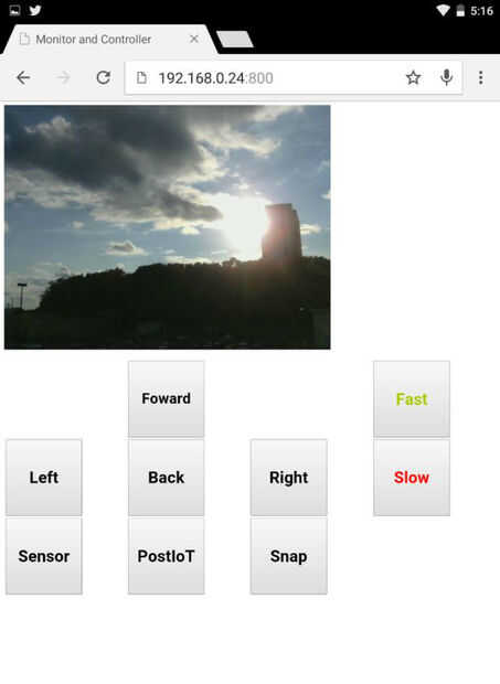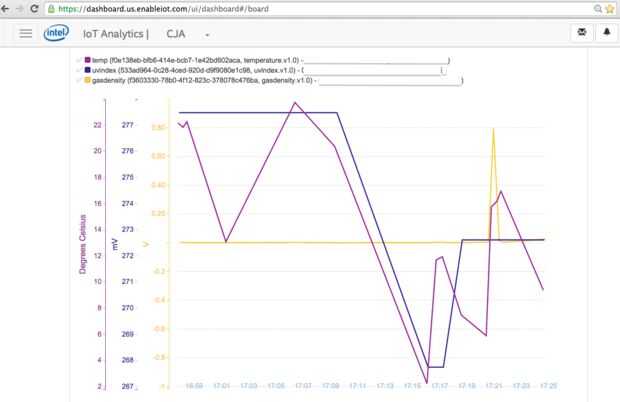 Enhorabuena! se hacen y ahora listo para conducir al rover utilizando la aplicación web de control y tomar la temperatura, la densidad del Gas y las lecturas del índice UV en tiempo real haciendo clic en el botón de Sensor y también publicar los valores de a nube IoT analítica de Intel, para una vista gráfica como se muestra en la pantalla por encima de...