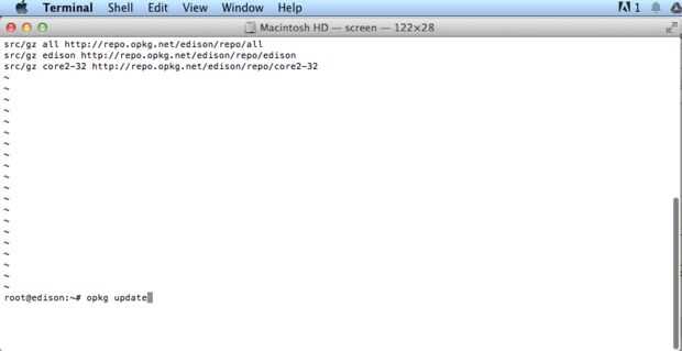 Ahora si eliges puede utilizar ssh terminal o la terminal de la pantalla para configurar las direcciones URL para el repositorio de paquetes oficiales para el Edison.