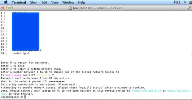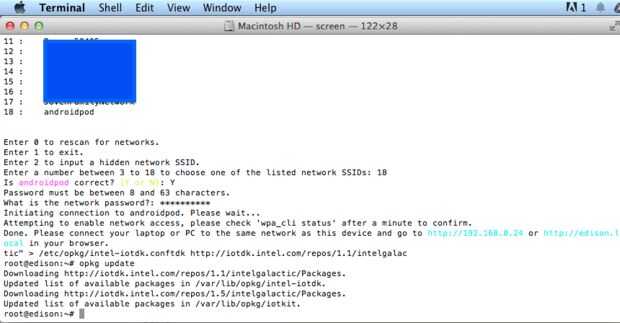 y presione la tecla de enter tarda unos 10 segundos para el Edison a buscar redes Wifi y enumerarlos como se muestra en la pantalla arriba. Escriba el número que coincide con le WiFi router, en mi caso "androidpod" llamo mi nombre de red que corresponde a 40 en la lista