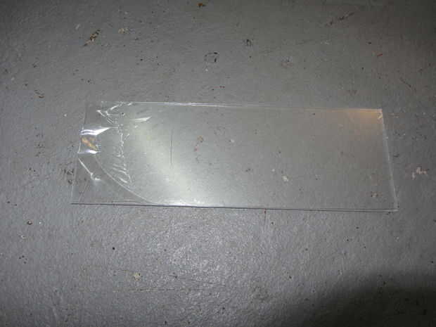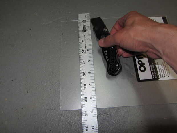 Tomar el 8 x 10" pieza de plexiglás y corte hacia abajo hasta una 8 x 3" pieza. Esto puede hacerse fácilmente utilizando tu regla y el cortador de la caja como se muestra en la primera imagen. Anotar el plexiglás a lo largo de la regla varias veces hasta que obtengas un buen surco en el plexiglás. Luego poner la hoja con un borde en un banco o una mesa justo a lo largo de esa línea y ajustar la pieza el resto del camino. Como se anotó correctamente, debe romper sin problemas. Terminarás con una pieza que se parece a la segunda imagen.