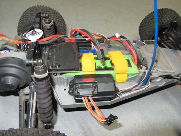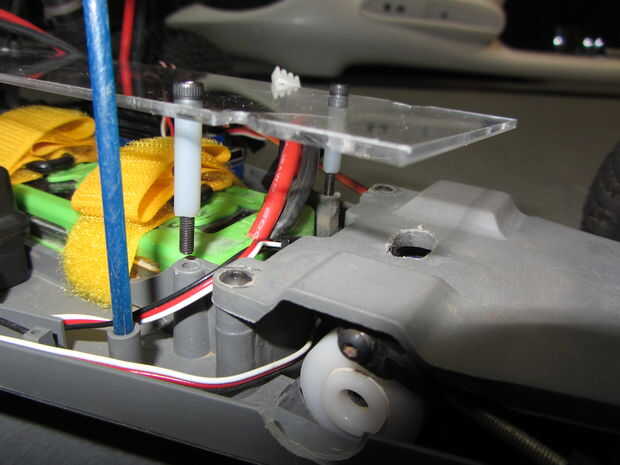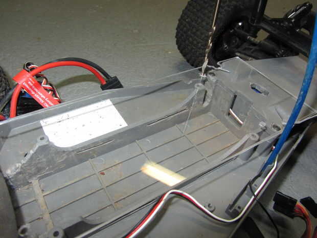 Una vez que haya terminado, alinee el plexiglás agujeros con los agujeros donde el Monte ESC se conecta al chasis. En el otro extremo de la hoja, marcar donde los agujeros hay que taladrar para ir donde los mensajes de la barra de batería utilizado y luego perforar los agujeros. Puede obtener la idea básica en la cuarta imagen. No taladre como muestra en la imagen a menos que quieras que crack! Simplemente marca donde los agujeros deben ser y luego use la punta de madera que he mencionado más arriba.