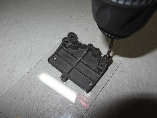 Usando la placa de ESC que extrajo en el apartado anterior, coloque en un extremo del plexiglás y hacer marcas en los cuatro orificios exteriores para obtener las ubicaciones de perforación adecuadas para cada agujero como se muestra en la tercera imagen, luego cada taladro.