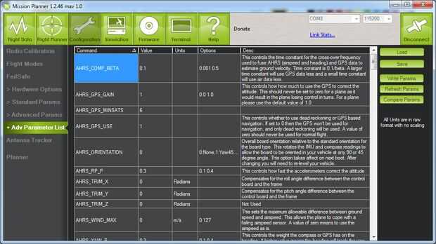 Cuando se carga el firmware correctamente, debe conectar a la APM por el planificador. Esto puede hacerse ya sea por mantener enchufado mediante el cable USB o mediante el módulo de telemetría y la conexión a través de eso. Asegúrese de seleccionar el puerto COM adecuado independientemente en la parte superior derecha del panel de administración, deje la velocidad en baudios tasa a 115200 y haga clic en conectar. Al principio, probablemente buscará MavLink mensajes y luego comenzará a cargar los parámetros.