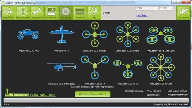 Descargar el archivo MSI de planificador de misión (MP) o ZIP de http://ardupilot.com/downloads/?category=4 e instalar el programa. Este programa se utilizará para cargar el firmware en la APM y la pantalla principal puede verse en la primera imagen.