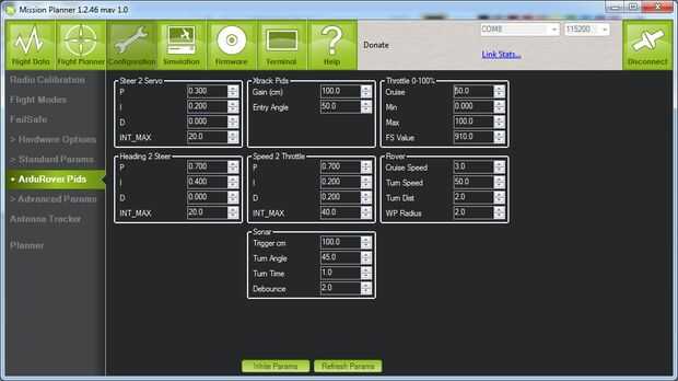 A la izquierda del panel de administración, deberá hacer clic en "Parámetros estándar" y luego el reloj en ArduRover Pids. Ver la segunda imagen de los valores utilizados en mi carro. Funciona bastante bien y debe darle un comienzo aunque probablemente tendrá que ajustar los parámetros a sí mismo más adelante si no son óptimos para su carro. Una vez que se han copiado los valores, asegúrese de hacer clic en "Escribir parámetros" en la parte inferior o guardará los parámetros comunes.