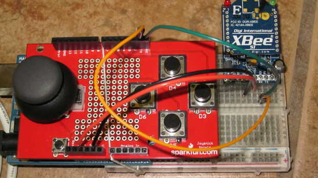 Montar a Rover según Robotshop instrucciones. Lo mismo con los escudos de Joystick y Xbee. Protoshield de lugar en el rover y el Xbee adaptador en la parte superior. Empezar a conectar los cables.