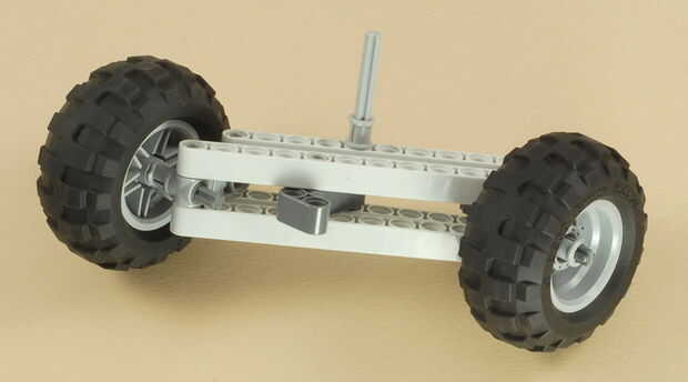 Cuando usted dirigir bruscamente a un lado, usted notará que el vehículo no gira muy bien, y las ruedas delanteras podrían empezar a deslizar hacia los lados. ¿Por qué crees que es? Imaginar el dibujo de trayectorias de la circular que las cuatro ruedas están tratando de seguir para hacer un giro brusco. ¿Qué les impide siguiendo las trayectorias circulares ideal? Si quita la clavija azul en el frente la palanca, que está diseñada para limitar el ángulo de dirección, la dirección puede hacer el vehículo intenta alejarse aún más, que hará aún más visible el problema. Hay realmente dos problemas que causan, como se explica en los siguientes dos desafíos.