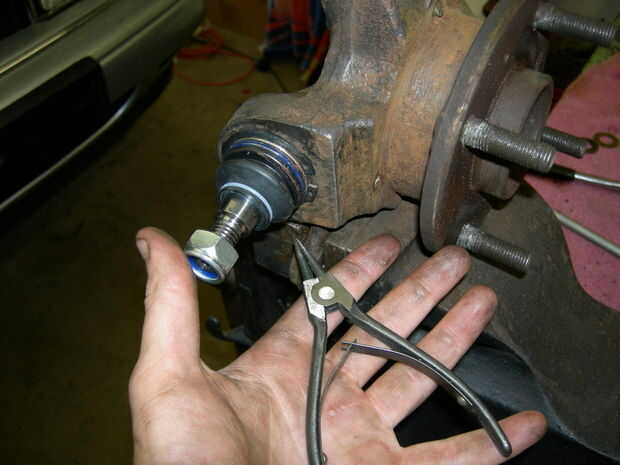 Retire el montante de la suspensión todo, quite el portador de la pinza de freno y el disco, el montante de la abrazadera en un vicio por las orejas de montaje para el portador de la pinza de freno, luego Martille los daylights vivos fuera de la rótula inferior hasta que mandila hacia fuera (primera Quite el anillo de retención...) Limpiar el orificio y grasa de la parte nueva y te toque en fácilmente. Usaré un mazo de 12lb para quitar el viejo y un pein de bola de 24 oz para adaptarse a una nueva.