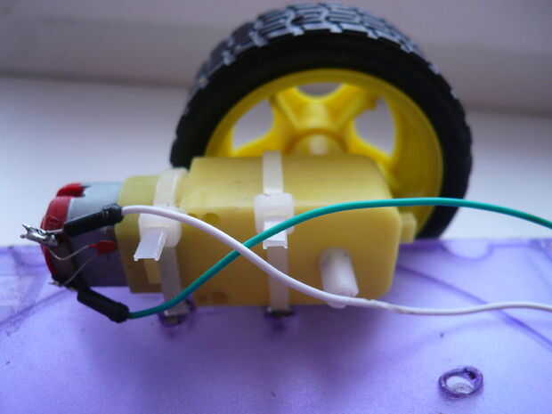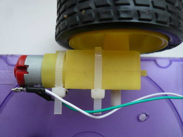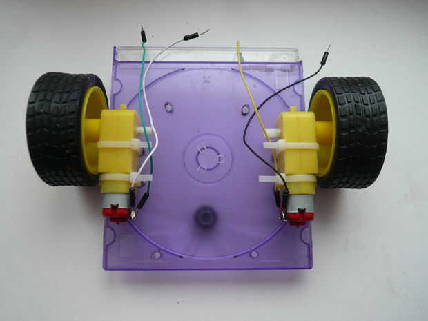 He utilizado la caja de CD slim como un chasis, hice 2 agujeros a cada lado de la caja del CD y luego piñón fijo motores con atadura de cables.
