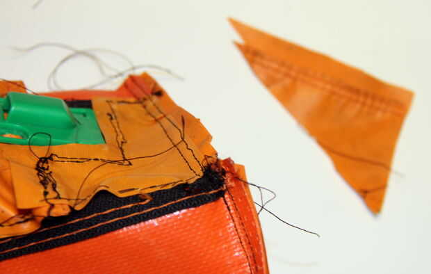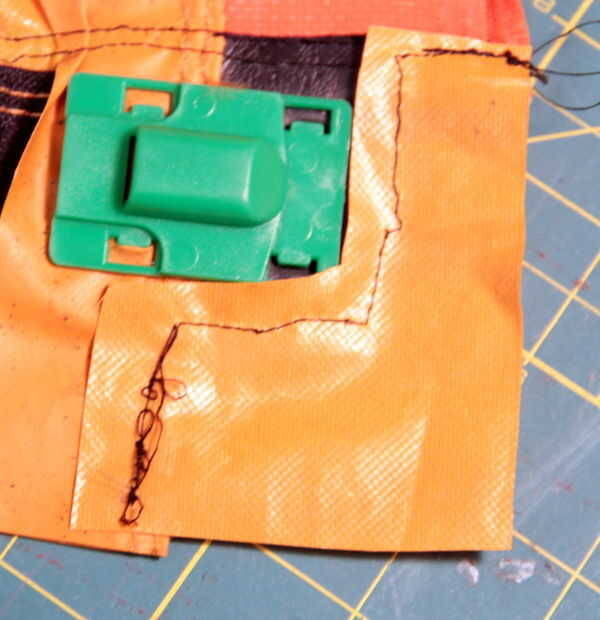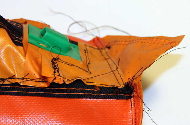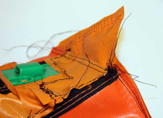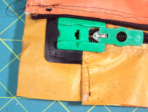 Pespuntear la cremallera en su lugar. La cremallera debe ser un poco demasiado corta; coser un parche de tela sobrante como se muestra.