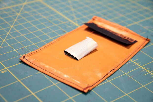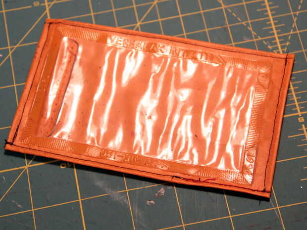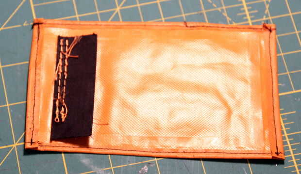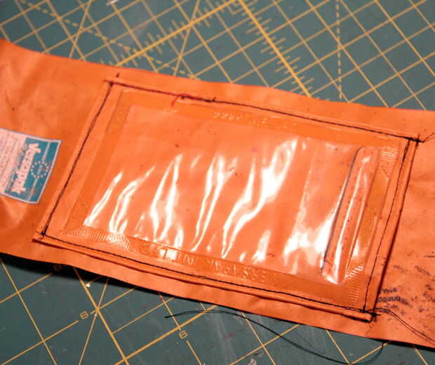 Dobladillar los bordes de la bolsa de plástico transparente. Coser en su tira naranja corto más llana. Deje la tapa abierta para que haya un claro bolsillo construido en y un bolsillo más grande opaco detrás de él.