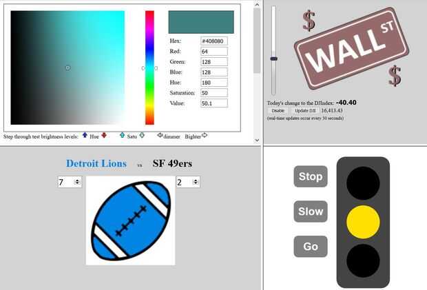 Luego está la página similar a la que usaré para convertir el dispositivo en un indicador de seguimiento de Dow Jones. El control deslizante y los botones son sólo en la página de demo DJI para fines de demostración. En la fuente de esta página hay código que desarrollé para volver a colorear una imagen de pantalla verde inspirada; con bastantes comentarios que usted también puede encontrar útil.