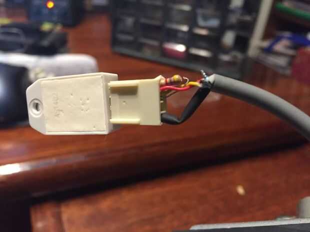 Soldar los cables rojo y amarillo cada uno con un conector y poner la resistencia entre ellos, así. También cubre éstos con encogimiento del calor para que no te un corto. Luego suelde el cable negro con un alfiler, así. Inserte los pernos del jefe del Pin de 4 siguiente