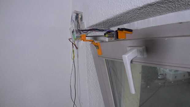 Montar los ventiladores en la base con dos tornillos para cada ventilador. Montar la base en el marco de la ventana y fijar el motor paso a paso en ella con algunos aglutinantes de carpintería y cinta aislante (otra vez: improvisar!).