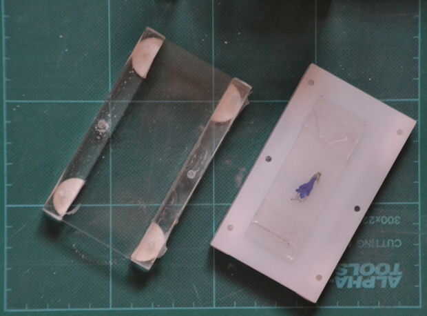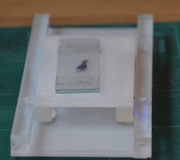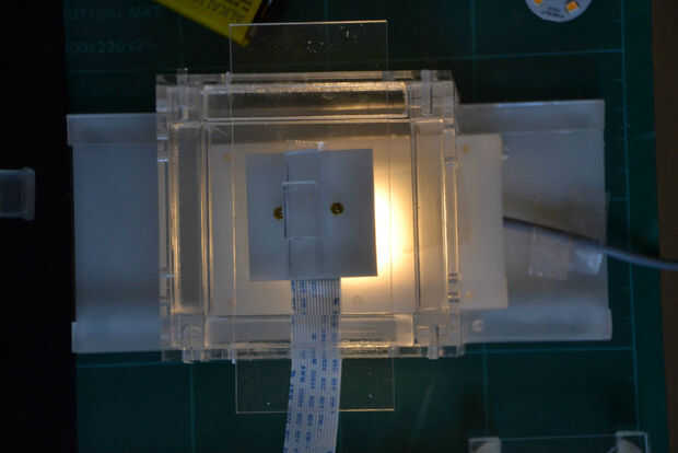 Para activar los tornillos M2 ir a través de los orificios de PCB la cámara cuidadosamente debe ensanchar los orificios con una broca de 2 mm. Ahora se pegan primero los tornillos aunque los orificios en la placa inferior, luego coloque la tuerca de primera sobre los tornillos, ahora Coloque la cámara sobre los tornillos y coloque el segundo conjunto de tornillos. Ajustar la posición de las tuercas. En caso que tenga que ajustar la colocación de los tornillos mediante la ampliación de uno o más de los orificios de la placa de soporte. Ahora coloque la placa media sobre la placa inferior, Compruebe la correcta orientación de los dos agujeros centrales (!) y unir las dos placas y fijar la posición de las cabezas de los tornillos con pegamento. Los restantes tornillos de M2 a través de la placa superior del palillo y pegar la placa superior a la media placa con las cabezas de los tornillos en los agujeros apropiados. Utilice suficiente pegamento para fijar las cabezas de los tornillos. Ahora puede colocar la placa de soporte de cámara larga en las ranuras de la "torre" y fijar la cámara en la placa con los dos tornillos.