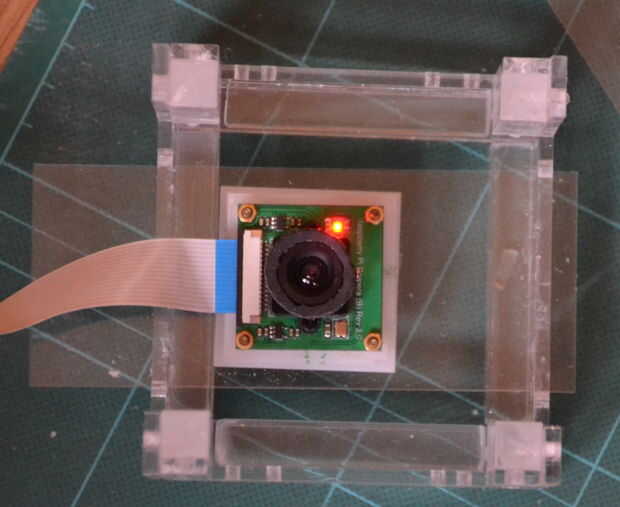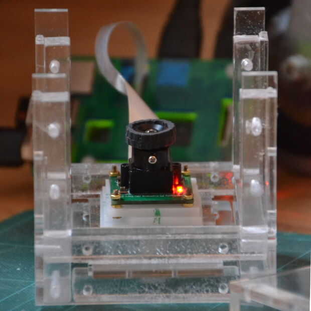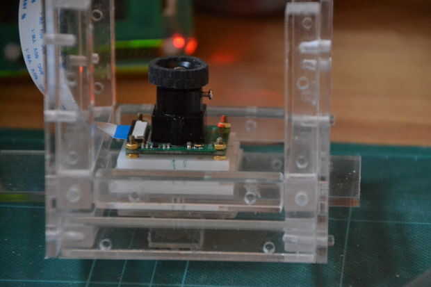 Como se describe en detalle en otra parte, no describo la configuración de la Pi y la cámara. Para facilitar el giro del objetivo para enfocar, he colocado una rueda de goma un poco ajustada de LEGO en el extremo del objetivo.