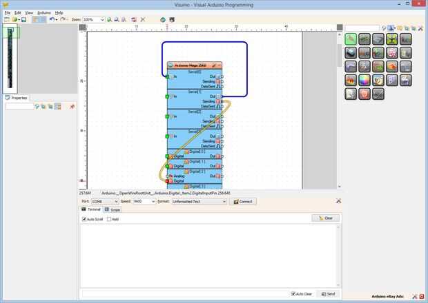 • Conectar la clavija de salida de "envío" del canal "serie [1]" del componente de Arduino en la clavija de entrada "Digital" del canal de "Digital [2]" del componente de Arduino (foto 1)