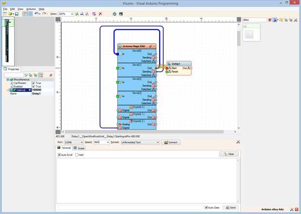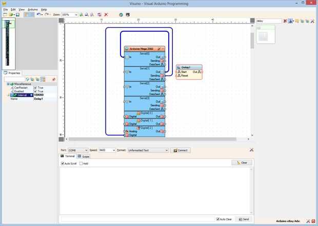 3. Conectar la clavija "a" del canal "serie [1]" del componente de Arduino en el "en" el pin del componente Delay1 (foto 3)